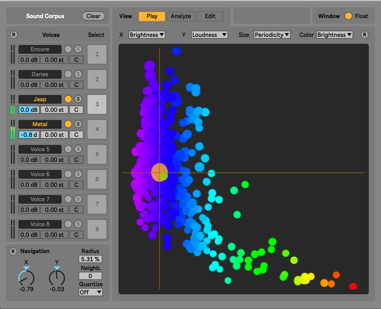 Mostanában nagyon szeretek egy Skatart nevű szoftvert használni, ami a konkatenatív szintézisen alapul. Szegmensekre bontja egy hang (sample, vagy valós időben történő hang) frekvenciaspektrumát, és egy envelope followerrel lehet aztán vezérelni ezeket a szegmenseket. A hangommal is tudom ezeket vezérelni, és azt is meg lehet határozni ebben a szoftverben, hogy milyen paraméterek alapján legyenek elrendezve a szegmensek – vagyis az X és Y tengelyhez rendelt paramétereket tudom meghatározni. Ezek a szegmensek egy 2D-s felületen aztán megjelennek egy mezőn, és ezeket tudom csoportosítani, mozgatni, megszólaltatni.