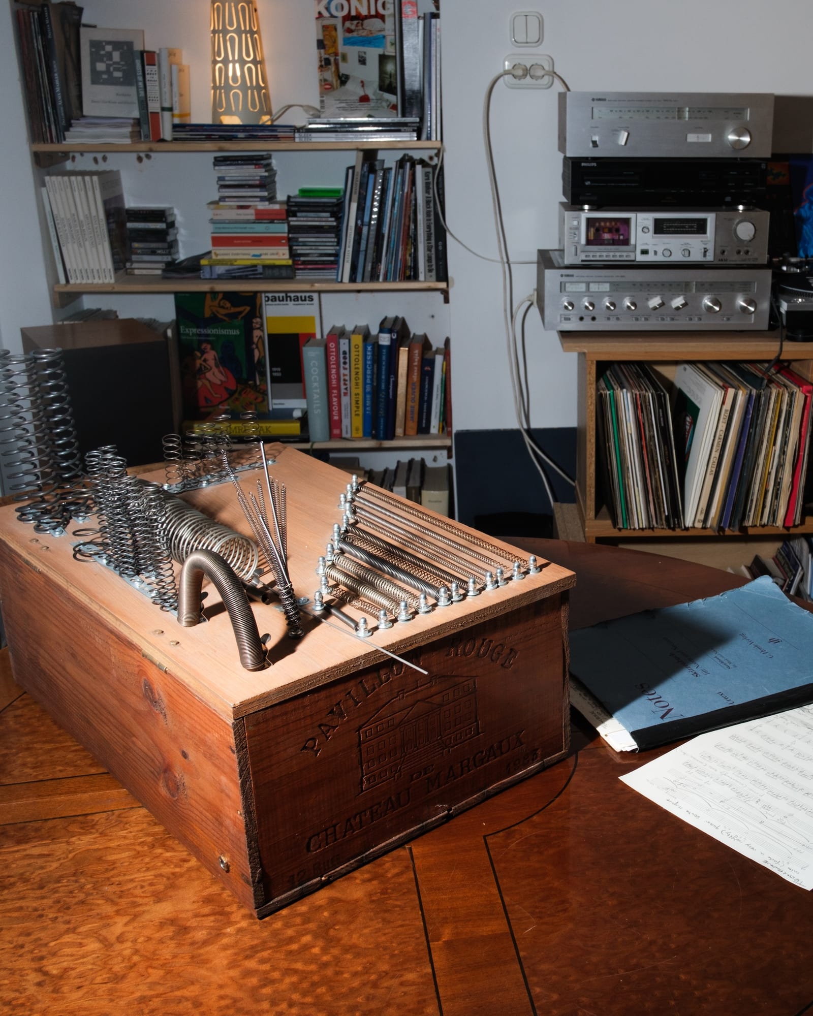 A zeném zaj-aspektusát pedig többek közt a saját építésű noiseboxom adja. Egy borosládából készítettük apukámmal. Különböző feszítettségű és merevségű rugók vannak rárögzítve, három kontaktmikrofon van benne, és egy jack kimenet van rajta. A rugók rezegtetik a hangtestet (a ládát), és ez adja a hangot a mikrofonok és a kimenet által. A különféle rugók mind máshogyan triggerelik a hangot, ezt pedig egy live szett során Abletonnal effektezni is szoktam. Tervezem továbbfejleszteni a noiseboxot, hogy más eszközökkel és módszerekkel is lehessen triggerelni a hangot – lehet, hogy mágneseket teszek majd bele, illetve tervezek írni hozzá egy MAX/MSP patchet. A noisebox amúgy természetesen egy létező dolog, ezt nem én találtam fel, de ez a modell itt, ahogyan én ezt megcsináltam édesapámmal: ez az én kis zajdobozom.