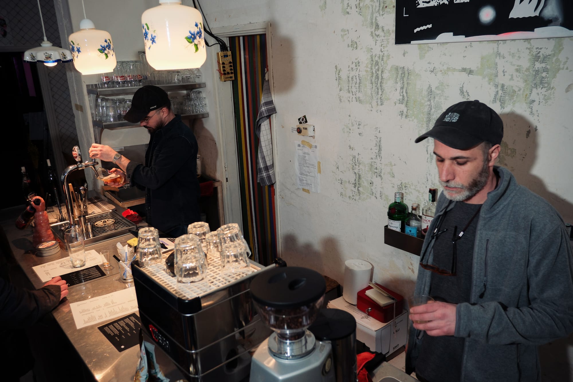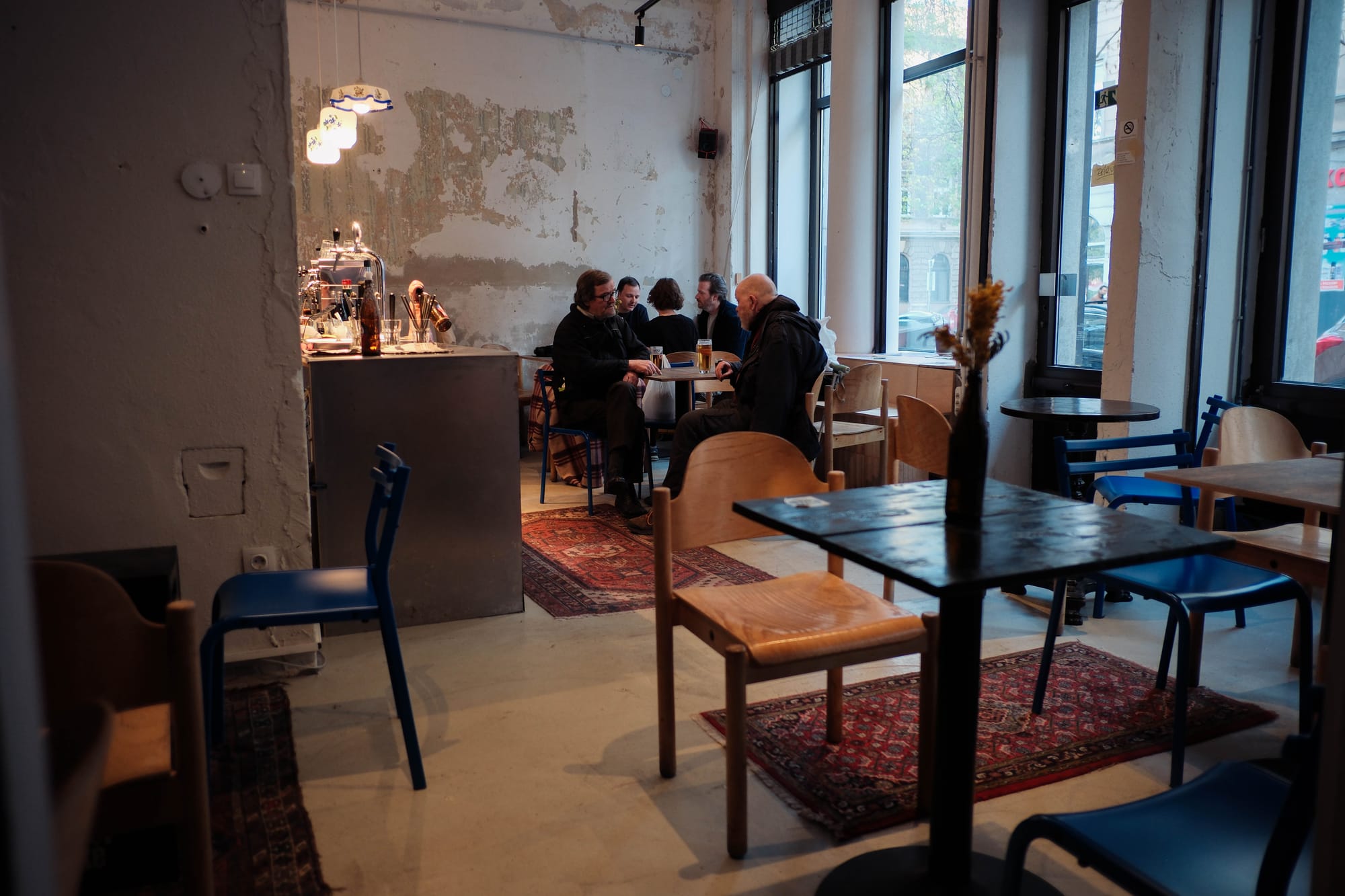 Dani: A tér szempontjából az, hogy teli ablakunk van, az egy főnyeremény. A kialakításban pedig szempont volt, hogy kurvára nincs rá pénzünk, minden átalakítás a villanyszerelésen kívül saját meló volt. Egyrészt engem vonz ez a hozzáállás, hogy nem hívsz mindenre embert, másrészt persze ez a gazdaságosabb megoldás. Illetve az fontos, hogy hol vagyunk – ha a 8. kerület közepén nyitsz helyet, az valamennyire behatárolja azt, hogy jó érzéssel milyen dolgokhoz és megoldásokhoz nyúlhatsz, hogy milyen a bútorzat, az egész miliő, hogy például ne legyen túl tiszta. A rádióhoz és a közönséghez sem illett volna, ha ezt a falat lefestjük teljesen fehérre. Nem romkocsmázásból, hanem mert tájidegen lenne. Az itallaphoz ugyanez a hozzáállás, hogy nem matchát meg chai lattét akarunk árulni, hanem egy jóízű, nagyon alap kocsma kínálatot. Kőbányai is ezért van, nekem furcsa Budapesten Peronizni; ha Olaszországba megyek, akkor majd ott, ott meg Kőbányait nem iszom. Borból sincs nagy kínálatunk, de az hazai. Aztán jött Geri a campariszódával.