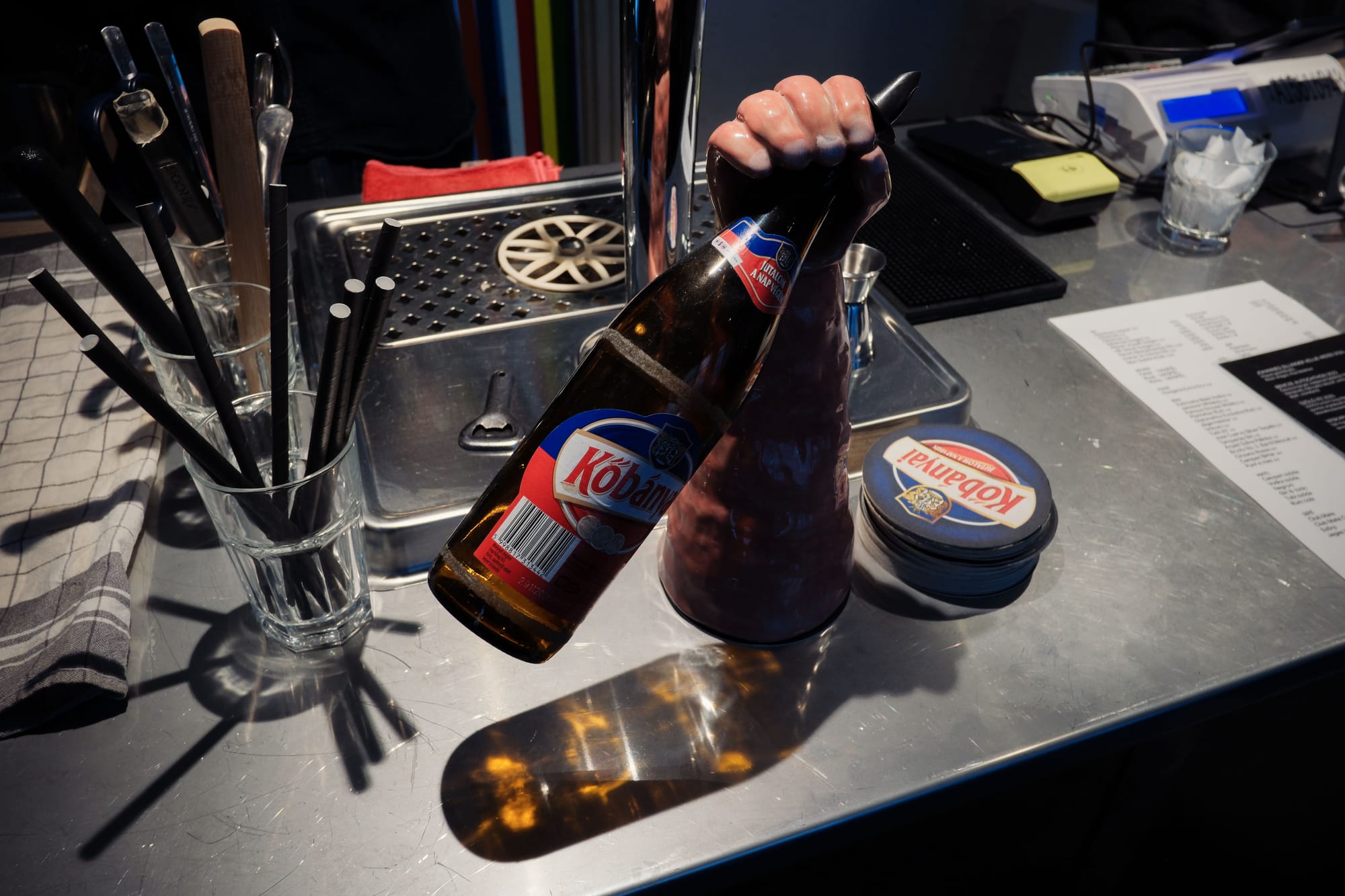 Dani: Ez szerintem nagyon jó lett volna, én reméltem, hogy az itallapig sem jutunk el, de lett. Nekem az tetszik, ha minél kevesebb vendéglátós kelléket látsz egy helyen. A sörcsapunk is ilyen, a Dreher utál minket, mert mi a “kobra” sörcsapot kértük. Hogy miért kérünk csapra Kőbányait, már ezt sem értették. Aztán idehoztak egy hiper-szuper Kőbányais sörcsapot, ami világít meg ilyen női formája van, és akkor kérdeztük, hogy nincs-e másik, a klasszikus, ami csak egy rúd, ami kijön a pultból. Mondták, hogy ezt hívják kobra csapnak, de hogy ilyen már nincs, ők ezt nem viszik, nem kérik a helyek. Másfél hónapnyi munkánk volt, hogy hozzanak nekünk mégis ilyet. Szerintem ez egy statement is, hogy nem egy vendéglátóhely akarunk lenni, és önteni az emberekbe a szeszt. Csak az a célja a helynek, hogy fenntartsa önmagát és a rádiót. Ehhez elvileg nem kell sok, persze sokkal több, mint gondoltuk.